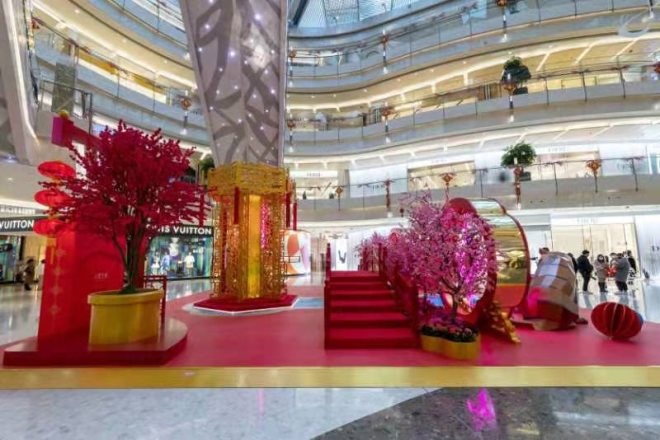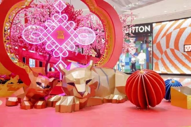 是次商場中庭以雍容華貴的霓燈庭院為靈感,一座高達(dá)4米金碧輝煌的金色六角燈籠矗立其中,雕刻精美的如意橋橫跨于錯(cuò)落別致的庭院中,大紅燈籠張燈結(jié)彩,桃花成林馥郁芬芳,呈現(xiàn)一派繁華盛景。