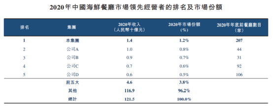 根據(jù)弗若斯特沙利文的報告,按2020年餐廳數(shù)量和收入計算,七欣天是中國最大的海鮮餐廳,在高度分散的中國海鮮餐飲市場占據(jù)1.2%的市場份額。