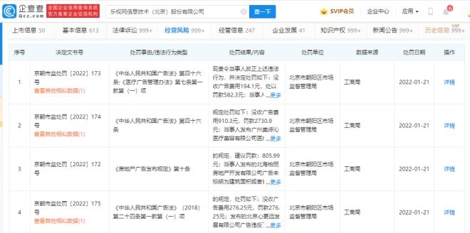 1月26日消息,企查查App顯示,近日,樂(lè)視網(wǎng)信息技術(shù)(北京)股份有限公司新增多條處罰信息,處罰內(nèi)容均為廣告違法,分別被處以千元罰款,其中醫(yī)療廣告違法被罰920元。