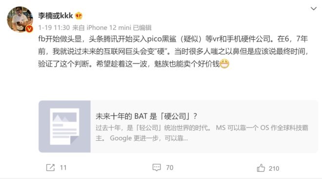 值得注意的是,在此次“收購事件”被曝光前,前魅族CMO李楠曾發(fā)博表示希望魅族能賣個好價錢,似乎也在暗示其將要被收購的命運。