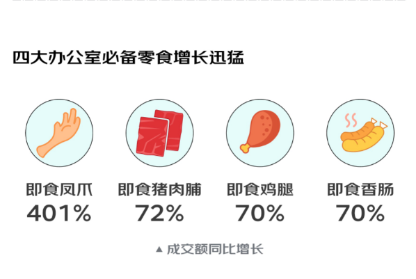 從成交額同比增速來(lái)看,功效、成分“反攻”顏值,活性乳酸菌、燕麥飲等成為增速最快的五大新健康食飲。而低糖低卡食品的增速八強(qiáng)中,最搶眼的是低糖低卡蛋糕,成交額同比提高近6倍。辦公室零食中,超8成職場(chǎng)人吃過(guò)“肉零食”,即食鳳爪以超4倍的增速領(lǐng)跑這一細(xì)分賽道。