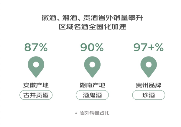 此外,以安徽的古井貢酒、湖南的酒鬼酒、貴州的珍酒為代表的區(qū)域名酒正在加速全國(guó)化,產(chǎn)地以外的省份銷(xiāo)量占比遠(yuǎn)超本地。