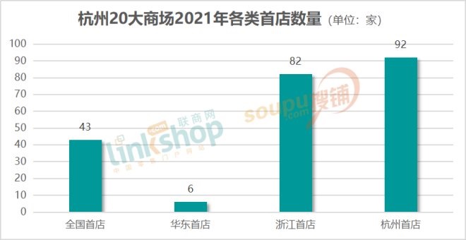據(jù)聯(lián)商網(wǎng)零售研究中心統(tǒng)計(jì),2021年杭州20大商場(chǎng)共計(jì)引入各類首店達(dá)223家,其中全國首店有43家,華東首店6家,浙江首店82家,杭州首店92家。