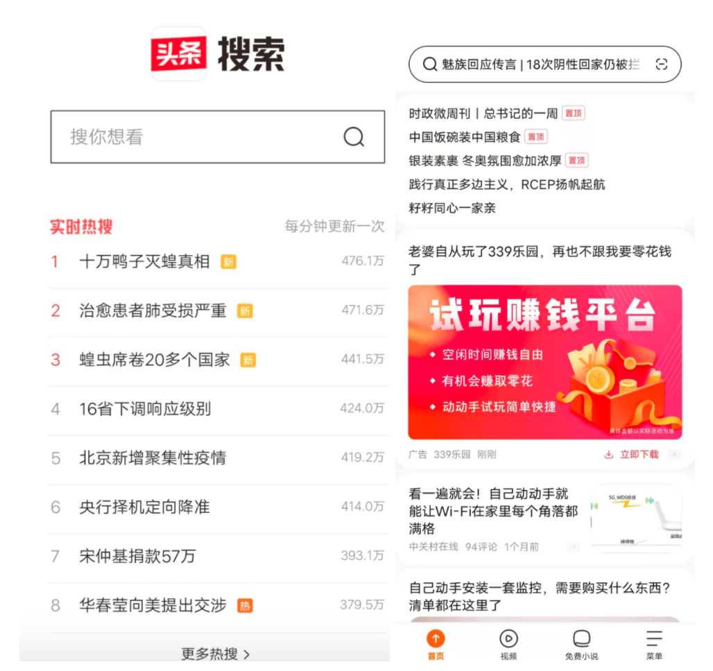 左為頭條搜索界面,右為悟空搜索界面