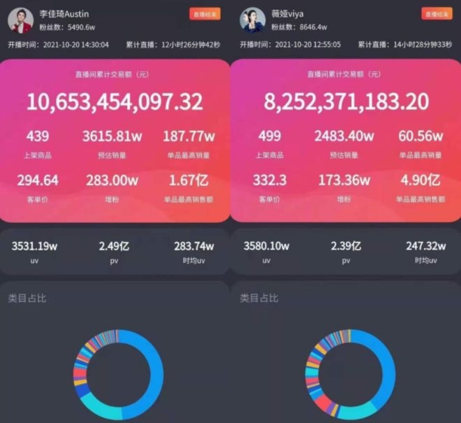 薇婭“存活”階段的帶貨實(shí)力,備受公認(rèn):2020年,全年銷售額310.9億元;2021年天貓雙十一預(yù)售首日,薇婭直播間銷售額為82.52億元。