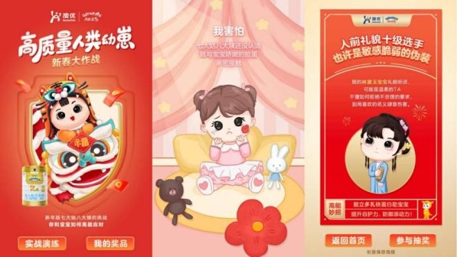 1月24日,“高質(zhì)量人類(lèi)幼崽新春大作戰(zhàn)”H5一經(jīng)推出,再度刷屏微信朋友圈,精確戳中春節(jié)親子家庭痛點(diǎn),令無(wú)數(shù)家長(zhǎng)紛紛留言“太真實(shí)了”“代入感太強(qiáng)”。澳優(yōu)能立多聚焦春節(jié)走親訪友時(shí),各種親戚對(duì)待家中寶寶的不當(dāng)行為,通過(guò)打造更富有趣味性和畫(huà)面感的互動(dòng)H5,指導(dǎo)家長(zhǎng)們教導(dǎo)寶寶如何機(jī)智化解危機(jī),從而解鎖寶寶的新春高能技能。