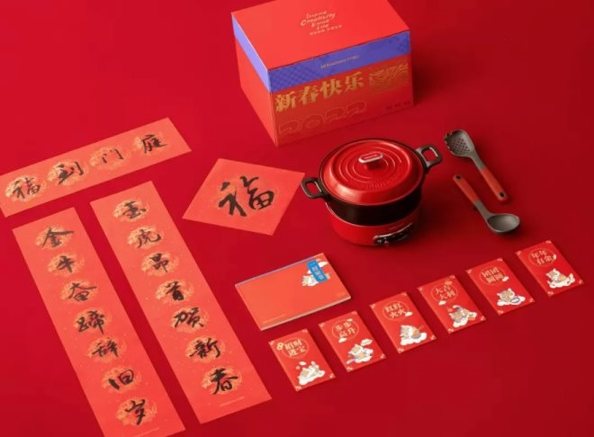 百度的禮盒套裝包括零食禮包、窗花、對(duì)聯(lián)、月歷套裝、新年筆記、盲盒等等。此外,還人手一口方形的定制款多功能涮烤鍋。