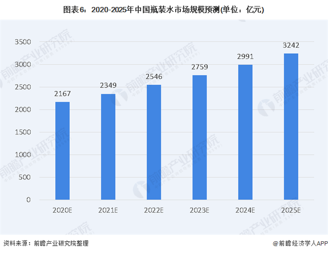 根據(jù)觀研天下整理的數(shù)據(jù)顯示,我國瓶裝水市場規(guī)模近年來持續(xù)提升,從2014年的1237億元增長至2019年的1999億元,年均復(fù)合增長率達到10.07%。前瞻產(chǎn)業(yè)研究院預(yù)計,未來幾年中國瓶裝水市場規(guī)模將以8%-9%的增速增長,2025年市場規(guī)模有望突破3000億元。