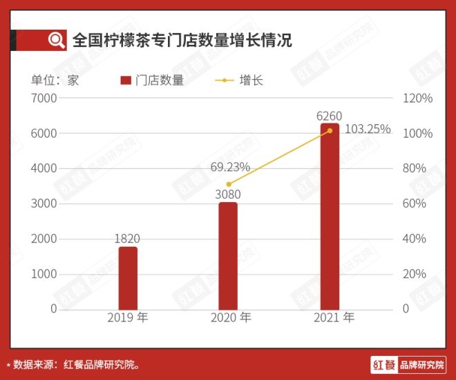 伴隨著檸檬茶品類的熱度高漲起來,檸檬茶代表品牌們也進入了發(fā)展快車道。紅餐品牌研究院預估,2021全國檸檬茶專門店數(shù)量有望超過6000家,而這一數(shù)值在2020年還只是3000多家。與此同時,2021年檸檬茶市場規(guī)模預計在百億元以內(nèi)。