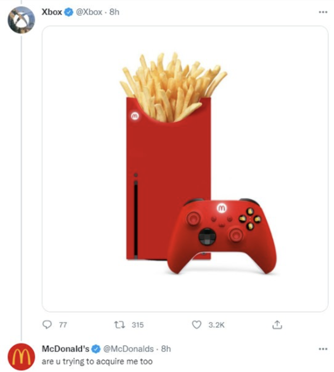 在上周,麥當(dāng)勞與微軟的互動(dòng)也受到了關(guān)注。在微軟宣布“天價(jià)”收購動(dòng)視暴雪后,Xbox做了一張麥當(dāng)勞薯?xiàng)l與游戲手柄的創(chuàng)意圖。