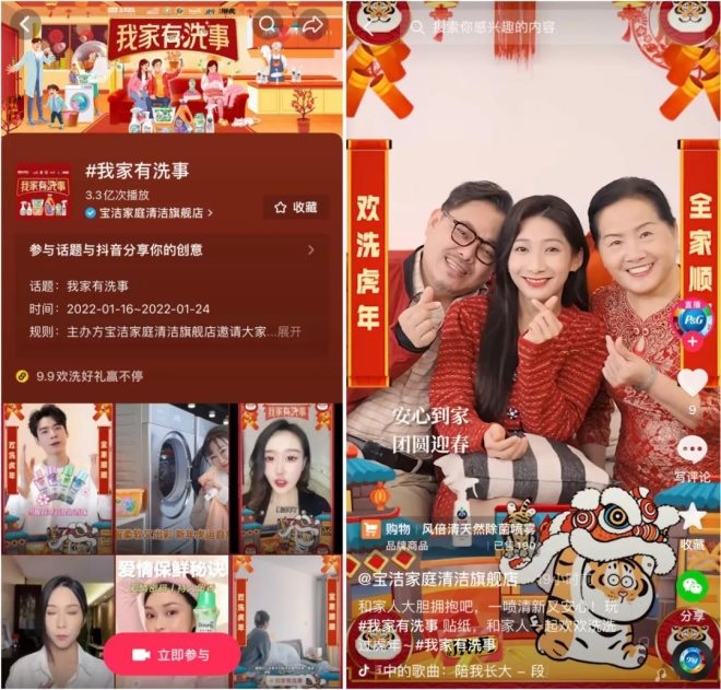 在此洞察之下,個(gè)護(hù)家清行業(yè)頭部品牌寶潔首次聯(lián)動(dòng)抖音電商生活類IP“抖in生活范兒”,策劃推出了一場以“我家有‘洗’事”為主題,精準(zhǔn)借勢(shì)“春節(jié)”、“冬奧”兩大時(shí)事熱點(diǎn)的營銷活動(dòng),順利實(shí)現(xiàn)品銷雙贏。