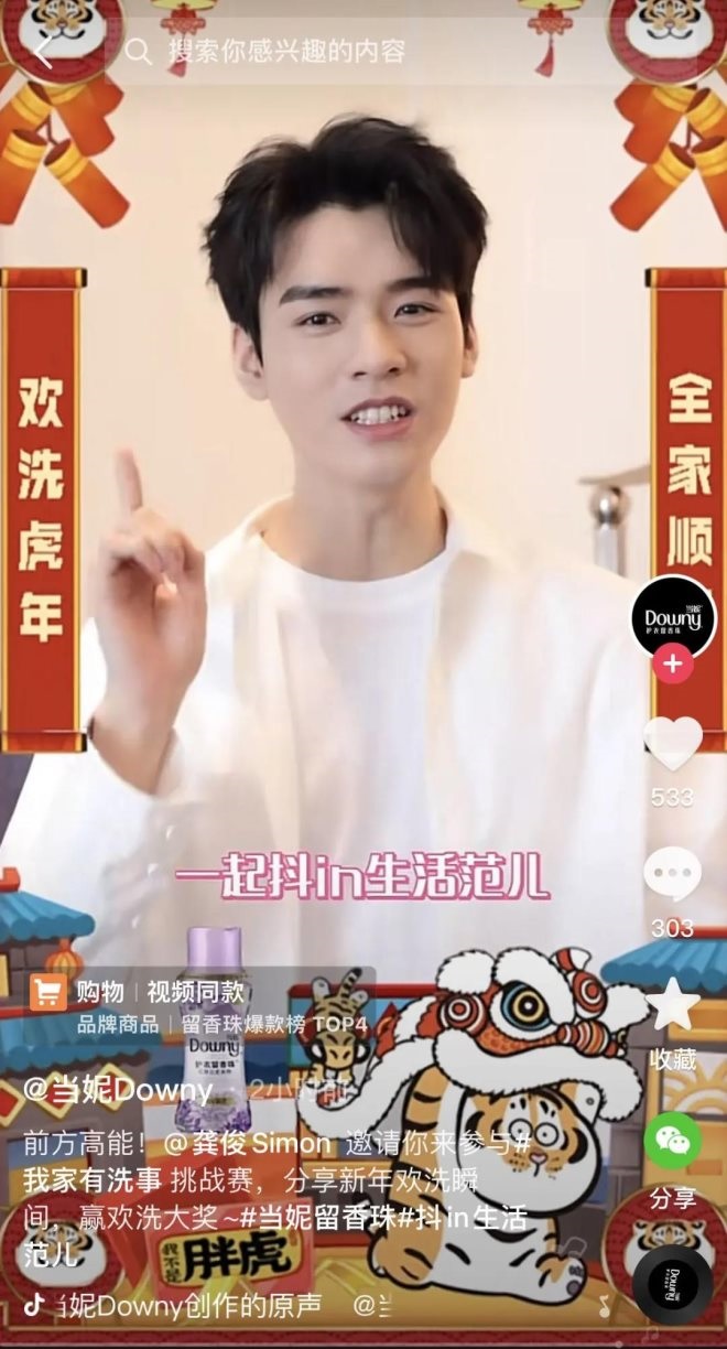 除此外,活動(dòng)還邀請(qǐng)了當(dāng)妮Downy品牌代言人龔俊參與#我家有“洗”事 短視頻挑戰(zhàn)賽。