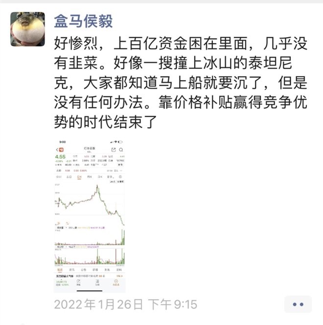 1月26日,盒馬CEO侯毅在朋友圈向叮咚買(mǎi)菜開(kāi)炮,稱(chēng)叮咚買(mǎi)菜上百億資金困在里面,幾乎沒(méi)有韭菜。好像一艘撞上冰山的泰坦尼克,船要沉了,靠?jī)r(jià)格補(bǔ)貼贏得競(jìng)爭(zhēng)的時(shí)代要結(jié)束了。此外,侯毅還特意配了一張叮咚買(mǎi)菜股價(jià)的圖片。