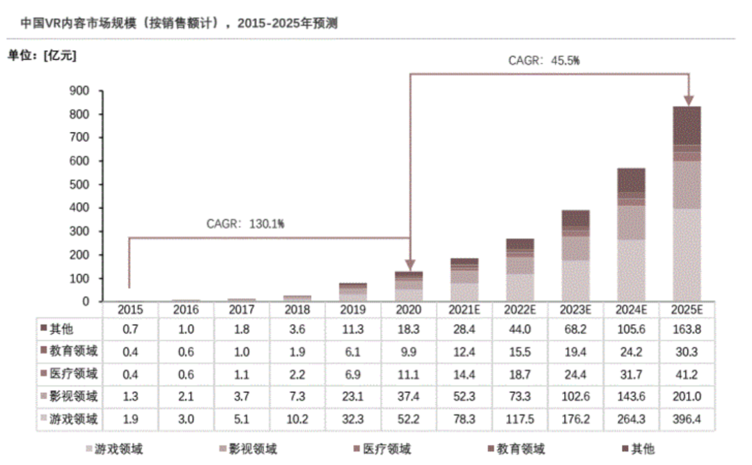 頭豹研究院發(fā)布的《2021中國VR產(chǎn)業(yè)概覽》指出,2025年,中國VR內(nèi)容的市場規(guī)模將達(dá)到832.7億元,這之中在未來5年內(nèi),增長最快的是企業(yè)培訓(xùn)的VR內(nèi)容,其增長率達(dá)55%。