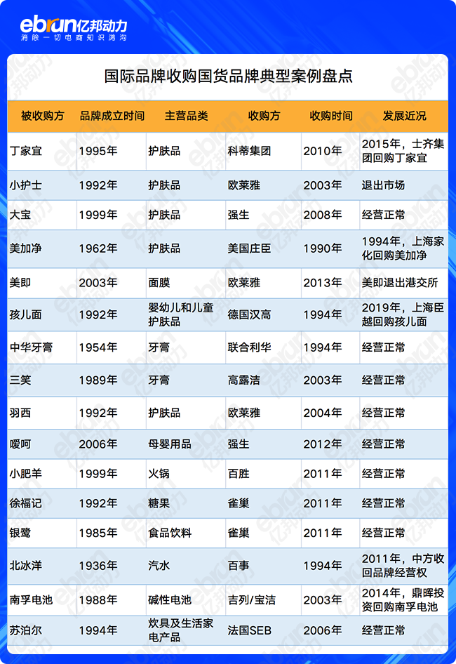 拿化妝品市場為例。以聯(lián)合利華、寶潔、歐萊雅為代表的國際品牌選擇大舉收購國貨品牌:歐萊雅買下小護士、美即和羽西,強生把大寶收入囊中,美國莊臣收走美加凈,法國科蒂收購丁家宜,聯(lián)合利華控股中華牙膏,德國漢高收購孩兒面……