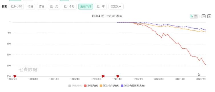 據(jù)七麥數(shù)據(jù)顯示,截至2022年1月25日,《幻塔》在中國iOS游戲免費榜中排名第195位,在中國iOS游戲暢銷榜中排名第53位,下滑趨勢明顯。