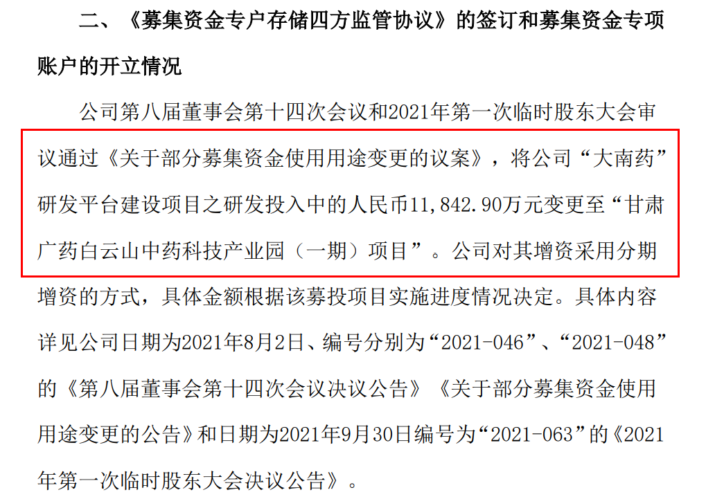 其中,有一段描述很清楚,是將原本用于白云山旗下“大南藥”板塊藥品研發(fā)費用的1.18億元經(jīng)費,改變使用范圍并投入到“甘肅廣藥白云山中藥科技產(chǎn)業(yè)園(一期)項目”。由于這個項目是分期投入,廣州白云山還將從其他的研發(fā)與營銷經(jīng)費中挪出部分資金,分批投入到項目建設(shè)過程中。