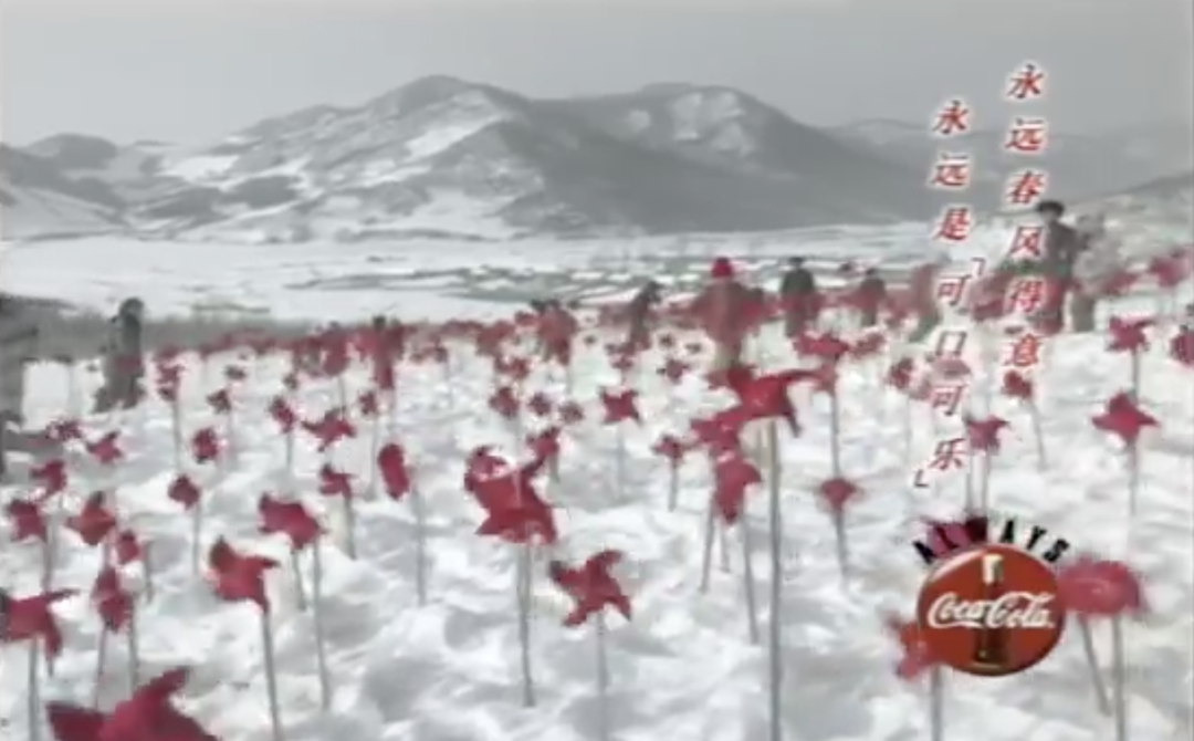 1999年,可口可樂推出了第一支正式的賀歲廣告。它在黑龍江的一個(gè)小村莊中取景,以兩個(gè)中國兒童為視角,借他們之手將紅色風(fēng)車插入可口可樂瓶中。