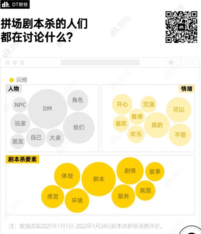 這和我們分析大家玩完拼場劇本殺后的評價后所得出的結(jié)論是一致的。除了跟劇本殺相關(guān)的“劇本”“劇情”“體驗”等要素,拼場劇本殺整體是熱鬧的,評論中大量提到“我們”“大家”“自己”和“朋友”,情緒的關(guān)鍵詞也基本偏向正面,包含“可以”“不錯”“開心”等等。