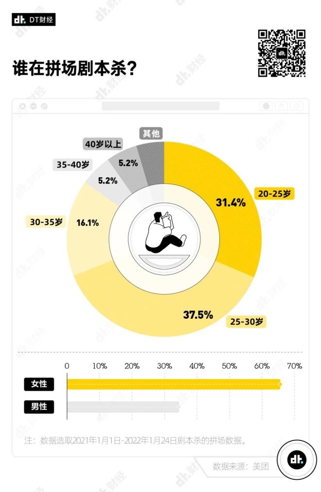 如果你預(yù)訂了一個劇本殺拼場,去到現(xiàn)場,大概率會碰到年紀(jì)以2字打頭的過渡期成年人。他們是拼場劇本殺的主流消費群體,占比接近7成。