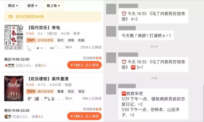 通常來說,要湊齊一組可以開車的隊友,比較常規(guī)的操作是約上身邊的朋友和同事。但最近我們發(fā)現(xiàn),年輕人開始流行“驚喜式抱團(tuán)”劇本殺:直接通過“拼場”來預(yù)訂劇本殺,隨時隨地跟陌生人組局開團(tuán)——這樣不僅能想玩就玩,還能拓展社交半徑、制造生活新鮮感。