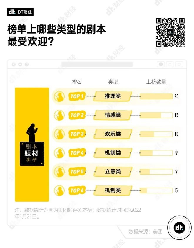 我們采集了美團(tuán)2022年1月的好評劇本榜(共52個產(chǎn)品),并對劇本標(biāo)簽進(jìn)行統(tǒng)計,發(fā)現(xiàn)從劇本題材來看,推理本數(shù)量最多,有23款劇本殺都以推理為主,在好評劇本榜中占比超過4成;隨后是情感本,也達(dá)到了15款。