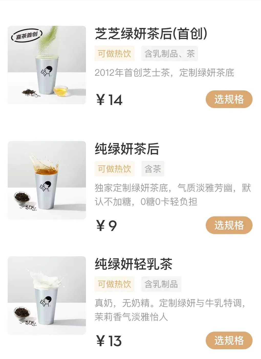 降價幅度最大的是喜茶的純茶系列,此前售價22元的“芝芝金鳳茶王”現(xiàn)下降到18元,最便宜的“純綠妍茶后”則直接降到個位數(shù)——9元。