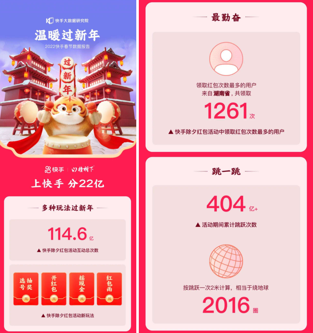 互動性方面,快手官方數據顯示,今年“上快手 分22億”紅包活動互動總次數達114.6億次,領取紅包次數最多的用戶共領取1261次,截至除夕當日,“跳一跳”活動累計跳躍超過404億次,按跳躍一次2米計算,可繞地球2016圈。同時,截至1月30日,有2萬人通過集卡獲得了666元或888元的早鳥紅包。