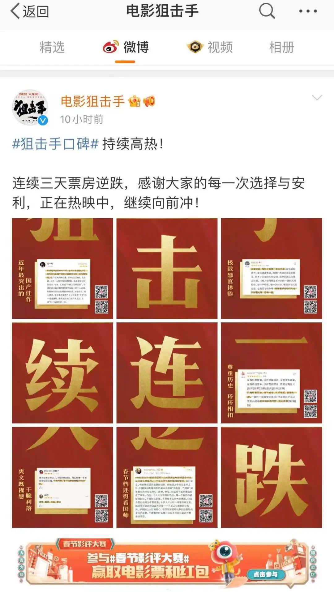 開幕式結束第三天,電影狙擊手官方發(fā)布微博稱,《狙擊手》票房三天逆跌(在大盤普遍下降的情況下,實現(xiàn)增長)。