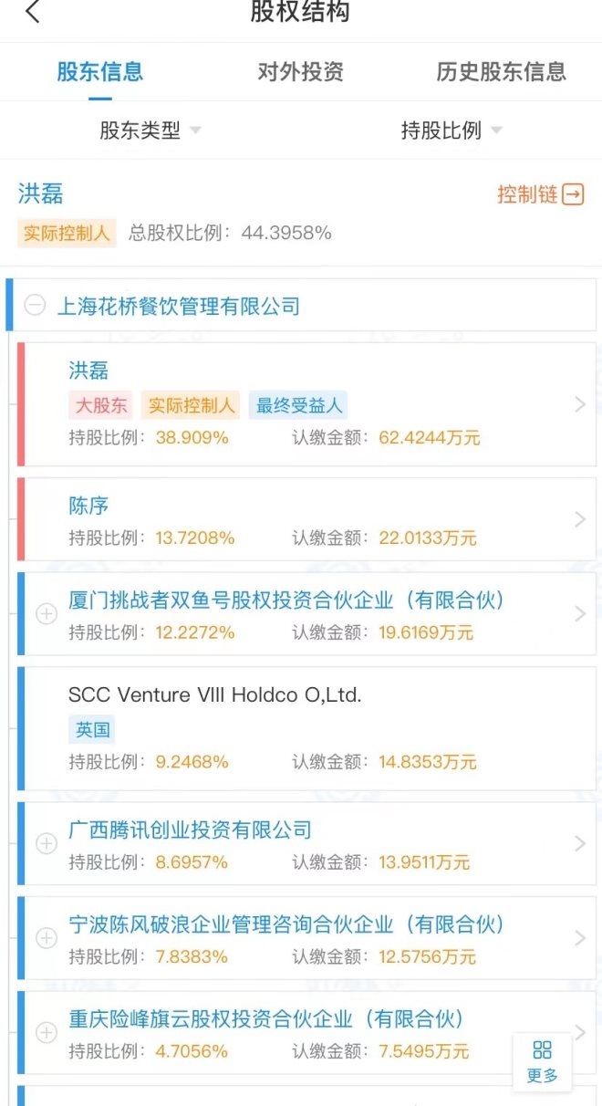 據(jù)企查查APP查閱顯示,廣西騰訊創(chuàng)業(yè)投資有限公司入股上;虿惋嫻芾碛邢薰荆(cè)資本增至約160.44萬(wàn)人民幣,增幅約13.48%,持股比例8.6957%,為公司第五大股東。