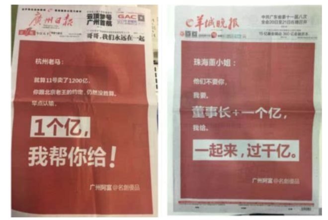 在得知董明珠不再擔任格力集團董事長一職后,“廣州阿富”再度出馬,包下《羊城晚報》頭版喊話董小姐,愿以“董事長+一個億”的豪爽邀請其加入名創(chuàng)優(yōu)品。