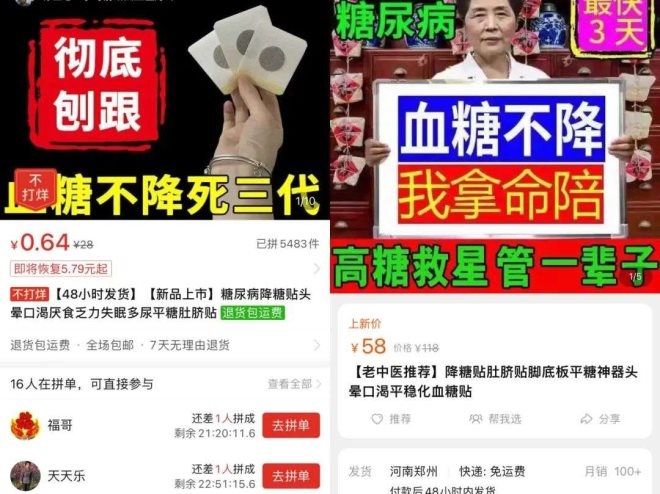 有的商家宣稱“華佗在世,人頭擔!保a(chǎn)品頁面顯示,只需要一枚小小的貼在足底或肚臍處的降糖貼,就能“根治糖尿病”。不知道的人還以為糖尿病領(lǐng)域新的專利技術(shù)誕生了。
