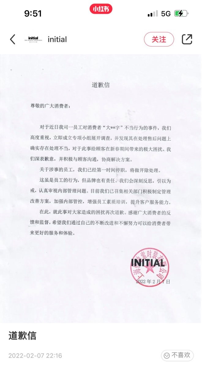 2月7日晚間,initial發(fā)布道歉信,稱涉事員工已經(jīng)停職,將做開除處理。