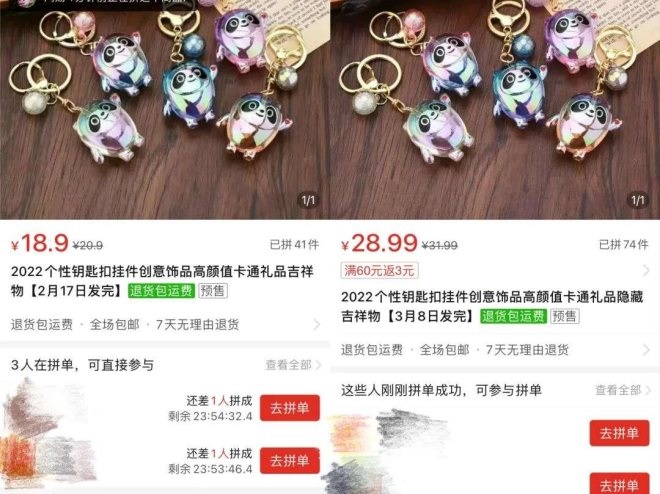 據(jù)獵云網(wǎng)通過(guò)搜索淘寶、閑魚、拼多多等平臺(tái)發(fā)現(xiàn),雖未有冰墩墩轉(zhuǎn)讓、代購(gòu)、溢價(jià)轉(zhuǎn)賣等消息出現(xiàn),但是在拼多多上,仍有個(gè)別商家在出售類似冰墩墩鑰匙扣等周邊產(chǎn)品,售價(jià)在十幾元到幾十元不等,客服表示“并非官方正品”。
