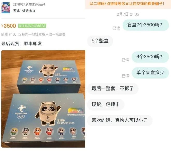 此外,在潮玩族小程序上,也可以看見不少用戶正在轉(zhuǎn)賣其手中的冰墩墩周邊產(chǎn)品及盲盒。據(jù)一位賣家表示,官方售價(jià)為118元/個(gè)的一組盲盒(6個(gè))未拆價(jià)格為3500元順豐包郵,誠(chéng)心購(gòu)買可小刀,溢價(jià)近5倍。