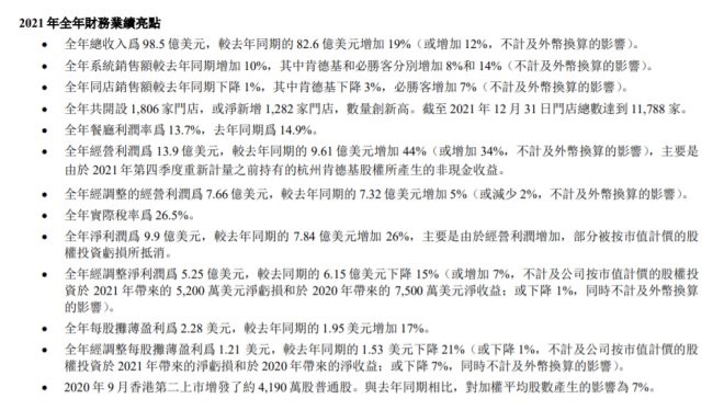2021年全年,百勝中國實現(xiàn)總收入98.5億美元,較去年同期的82.6億美元增加19%;全年系統(tǒng)銷售額較去年同期增加10%,其中肯德基和必勝客分別增加8%和14%;全年同店銷售額較去年同期下降1%,其中肯德基下降3%,必勝客增加7%;全年餐廳利潤率為13.7%,去年同期為14.9%;全年經(jīng)營利潤為13.9億美元,較去年同期的9.61億美元增加44%,主要是由于2021年第四季度重新計量之前持有的杭州肯德基股權(quán)所產(chǎn)生的非現(xiàn)金收益;全年經(jīng)調(diào)整的經(jīng)營利潤為7.66億美元,較去年同期的7.32億美元增加5%;全年凈利潤為9.9億美元,較去年同期的7.84億美元增加26%,主要是由于經(jīng)營利潤增加,部分被按市值計價的股權(quán)投資虧損所抵消;全年經(jīng)調(diào)整凈利潤為5.25億美元,較去同期的6.15億美元下降15%。
