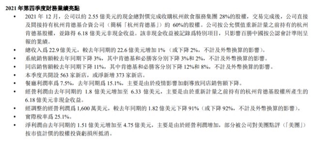 2021年第四季度,百勝中國實現(xiàn)總收入22.9億美元,較去年同期的22.6億美元增加1%;系統(tǒng)銷售額較去年同期下降3%,其中肯德基和必勝客分別下降3%和2%;同店銷售額較去年同期下降11%,其中肯德基和必勝客分別下降12%和8%;餐廳利潤率為7.5%,去年同期為15.1%,主要是由于疫情影響加劇導(dǎo)致同店銷售額下降。