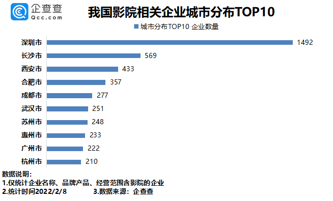 從城市分布來看,企查查數據顯示,深圳市有1492家影院相關企業(yè),排名第一。長沙、西安分別有569家、433家,排名前三。此后依次為合肥、成都、武漢等城市。