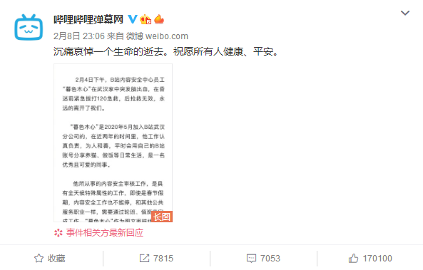 B站方面表示,公司2月7日已成立了專項(xiàng)小組,于2月8日早晨奔赴武漢。專項(xiàng)小組由公司的三位副總裁帶隊(duì),已經(jīng)在武漢慰問了“暮色木心”的家屬,并己經(jīng)和家屬溝通好了善后事宜。請大家相信,我們一定會(huì)處理好這位同事的身后事,給予家屬最大的關(guān)懷和支援。
