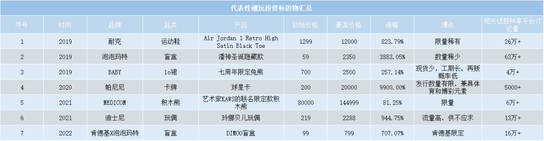 也就是說(shuō),當(dāng)一件產(chǎn)品同時(shí)具備稀缺性及圈層興趣性,那么它便掌握了成為潮玩投資標(biāo)的物的基礎(chǔ)邏輯。
