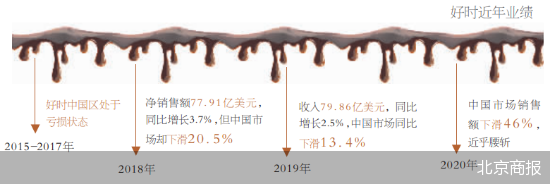 那時(shí),好時(shí)的業(yè)績(jī)已經(jīng)有些疲軟了。2015-2017年,好時(shí)中國(guó)區(qū)就處于虧損狀態(tài)。到了2018年,好時(shí)凈銷售額77.91q億美元,同比增長(zhǎng)3.7%,但中國(guó)市場(chǎng)卻下滑20.5%。2019年,好時(shí)收入79.86億美元,同比增長(zhǎng)2.5%,而中國(guó)市場(chǎng)同比下滑13.4%。