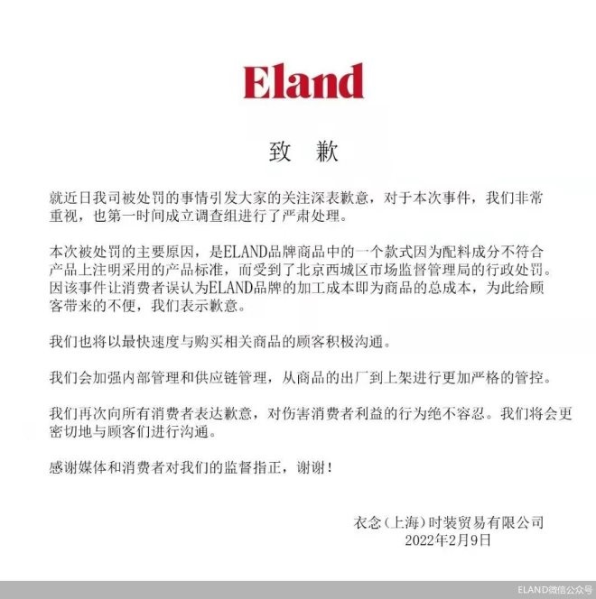 2月10日,Eland發(fā)布公告致歉,表示“該事件讓消費(fèi)者誤認(rèn)為ELAND品牌的加工成本即為商品的總成本”。