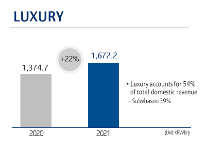 比如在今日歐萊雅集團發(fā)布的財務(wù)數(shù)據(jù)中可以看到,2021年歐萊雅高檔化妝品部已成為集團最大的事業(yè)部。去年全年,愛茉莉太平洋高端線在韓國也實現(xiàn)了22%的上漲,達(dá)到89億元人民幣,占總收入的54%。