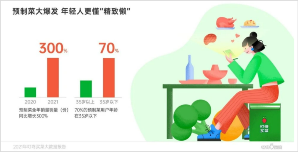 2021年,生鮮電商平臺(tái)叮咚買菜上預(yù)制菜全線產(chǎn)品銷量(單位:份)同比去年增長(zhǎng)300%,包含預(yù)制菜的訂單在整體訂單的滲透率已經(jīng)超過(guò)40%。