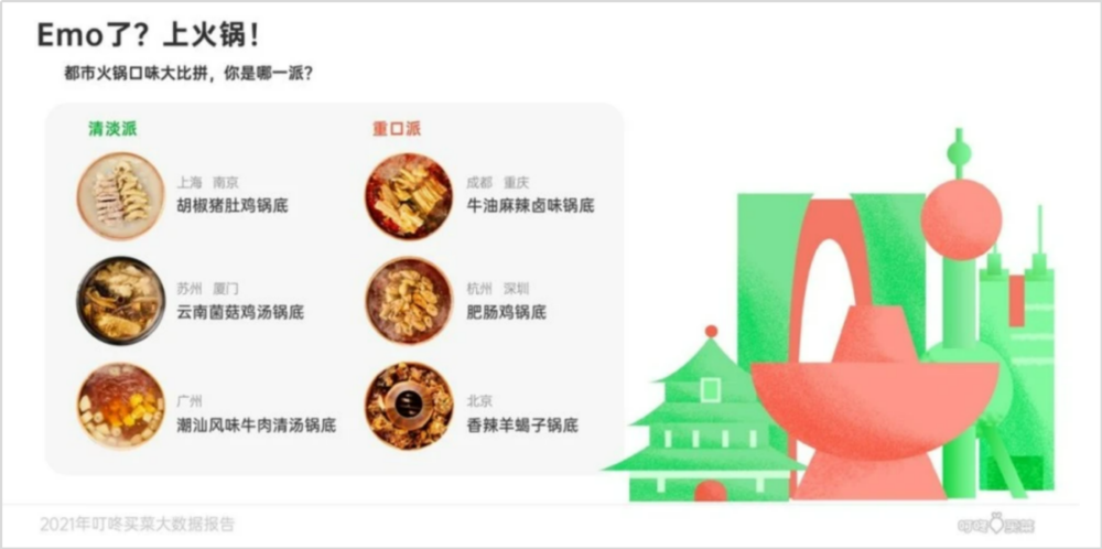 以叮咚買菜在火鍋產(chǎn)品的打法為例,根據(jù)其《2021年度消費(fèi)趨勢(shì)報(bào)告》數(shù)據(jù),2021年成都和重慶的用戶喜食牛油麻辣鹵味鍋底+8秒脆毛肚、原切肥牛片配菜;上海和南京地區(qū)的用戶買的最多的是清淡的胡椒豬肚雞鍋底+牛奶滑鴨血配菜;廣州人則獨(dú)愛(ài)潮汕風(fēng)味牛肉清湯鍋底+“90%手打牛肉丸”;而以北京為主的華北市場(chǎng)則忠于香辣羊蝎子鍋底+內(nèi)蒙谷飼雪花肥牛卷。