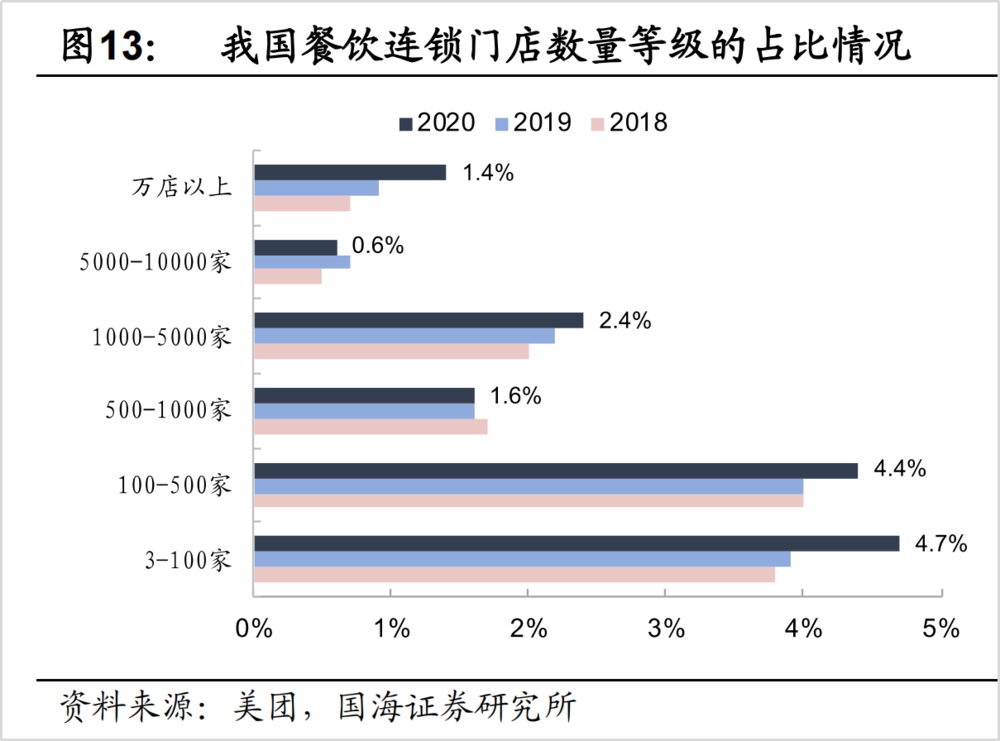 2020年我國(guó)餐飲連鎖化率提升至15%,各層級(jí)餐飲連鎖化率均呈現(xiàn)穩(wěn)步上升趨勢(shì)。其中以3-500家門店規(guī)模的中小連鎖餐飲企業(yè)居多,約占比為9.1%。尤其是頭部連鎖餐飲企業(yè)預(yù)制菜食用占比高達(dá)80%以上。