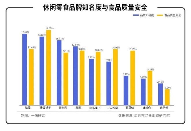 2021年8月,深圳市品質消費研究院在福田區(qū)消費者委員會指導下,對消費者關注較高的來伊份、良品鋪子、三只松鼠、鹽津鋪子、好想你、百草味等10個休閑零食品牌,開展消費者NPS口碑暨消費者行為研究調查。數(shù)據(jù)顯示,在品牌知名度表現(xiàn)上,來伊份位列最后一名。
