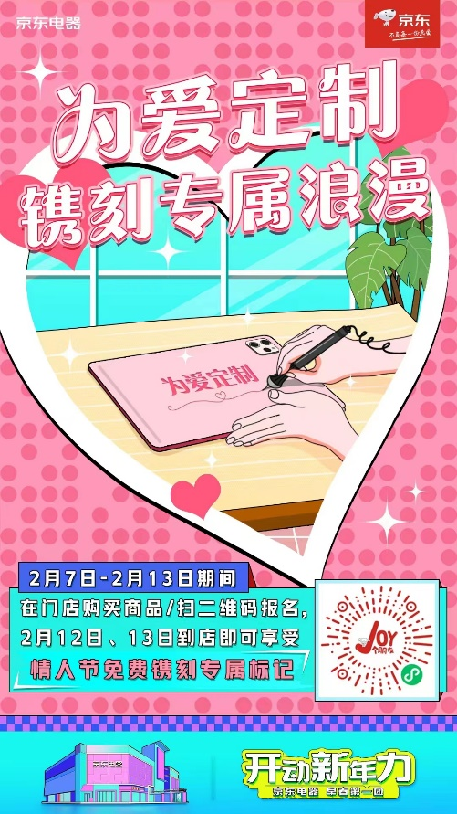 與此同時,手機、平板、電腦等新款3C產(chǎn)品也成為熱門備選。即日起至2月13日,京東電器除了發(fā)布情人節(jié)好物清單外,還推出線下門店情人節(jié)限定免費鐫刻活動,在活動期間到指定京東電器城市旗艦店購買產(chǎn)品或通過掃描線上JOY個朋友小程序報名均可參與情人節(jié)免費鐫刻專屬標記,包括但不限于家電/3C產(chǎn)品,如果消費者喜歡也可以自帶個人物品進行鐫刻。