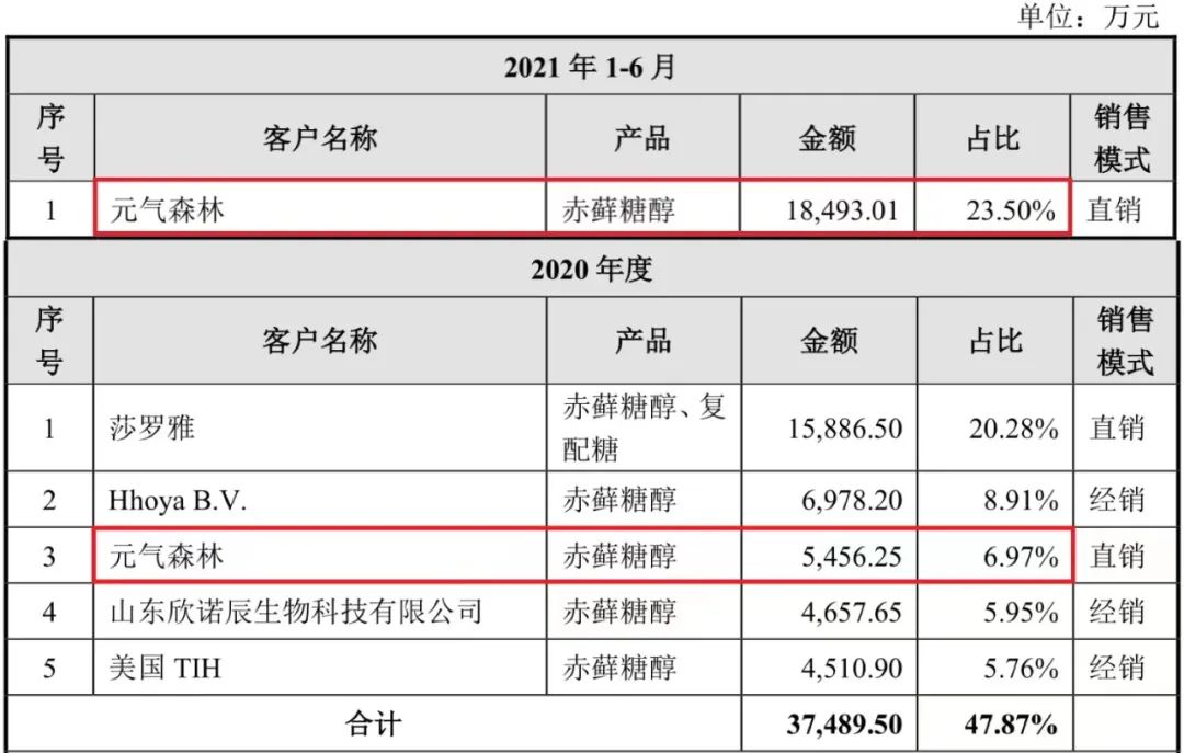 自從成為元?dú)馍值某嗵\糖醇供應(yīng)商,來自元?dú)馍值牟少徱?guī)模不斷提升。招股書顯示,在三元生物的前五大客戶中,元?dú)馍衷?020年的采購金額為5456萬元,占比6.97%。到2021年,元?dú)馍值牟少徑痤~約1.85億元,躍升為第一大客戶,占比達(dá)到23.5%。