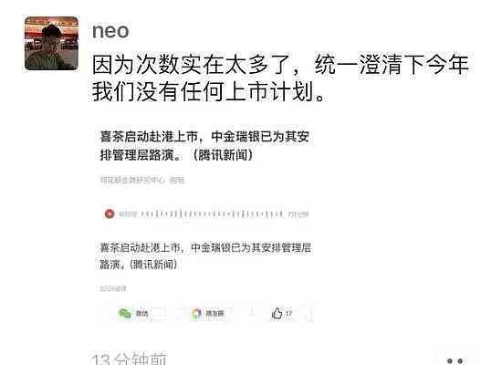 就上市問(wèn)題,喜茶創(chuàng)始人聶云辰曾于2021年3月在朋友圈澄清,表示2021年內(nèi)并無(wú)任何上市計(jì)劃。據(jù)中國(guó)企業(yè)家報(bào)道,喜茶投資方之一、美團(tuán)龍珠創(chuàng)始合伙人朱擁華也對(duì)上市說(shuō)法予以否認(rèn)。他表示,喜茶兩年內(nèi)不考慮上市,此次優(yōu)化只是喜茶組織架構(gòu)的提升,他們依舊保持長(zhǎng)期價(jià)值主張,耐心深耕茶飲賽道。